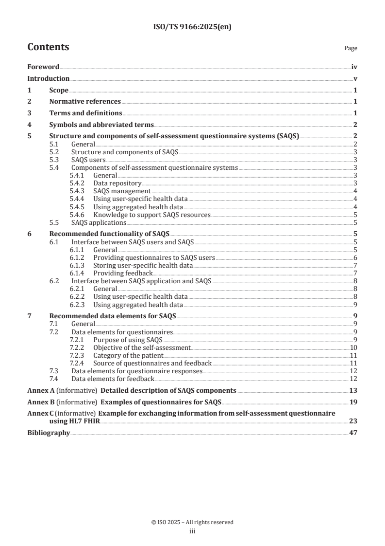 This guidance supports interoperable, user-centered self-assessment questionnaire systems that enhance preventive care, self-care and public health analytics. Keywords: ISO/TS 9166, self-assessment questionnaire systems, SAQS, health informatics, interoperability, FHIR, patient-generated health data.