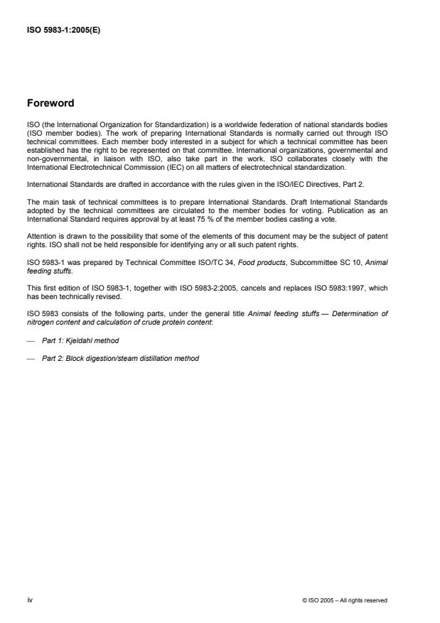 ISO 5983-1:2005 is a standard published by the International Organization for Standardization (ISO). Its full title is "Animal feeding stuffs - Determination of nitrogen content and calculation of crude protein content - Part 1: Kjeldahl method". This standard covers: ISO 5983-1:2005 specifies a method for the determination of the nitrogen content of animal feeding stuffs by the Kjeldahl process, and a method for the calculation of the crude protein content. The method does not measure oxidized forms of nitrogen or heterocyclic nitrogen compounds. This method does not distinguish between protein nitrogen and non-protein nitrogen. If it is important to determine the content of non-protein nitrogen, an appropriate method should be used.