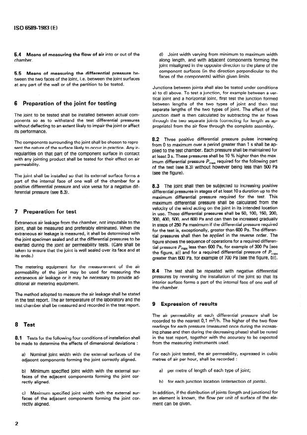 ISO 6589:1983 is a standard published by the International Organization for Standardization (ISO). Its full title is "Joints in building - Laboratory method of test for air permeability of joints". This standard covers: Specifies the test method to be used in laboratories for assessing the air permeability of non-opening joints between components in the exterior walls of buildings, whether the joints have been subjected to prior ageing or not. Does not apply to joints within components (for example the joint between glass fixed in a window frame and sealed with a glazing compound).
