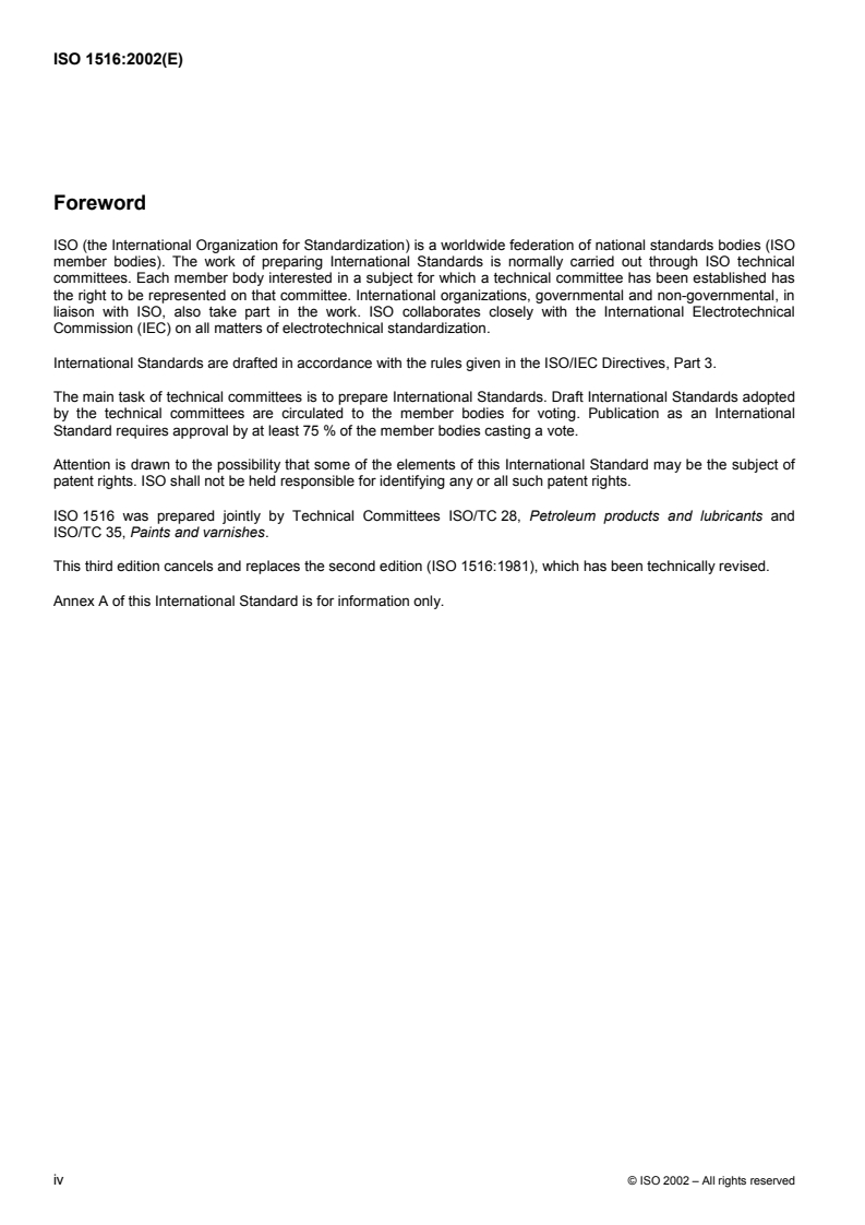 ISO 1516:2002 - "Determination of flash/no flash - Closed cup equilibrium method" specifies a standardized test to determine whether paints, varnishes, paint binders, solvents, petroleum and related liquids produce sufficient flammable vapour at a selected equilibrium temperature to ignite when exposed to a standard external flame. This is a pass/no‑pass test (flash/no flash), not a measurement of the exact flash point. The method covers test temperatures from −30 °C to 110 °C depending on the closed‑cup apparatus used and warns that solvent mixtures containing halogenated hydrocarbons can give anomalous results.