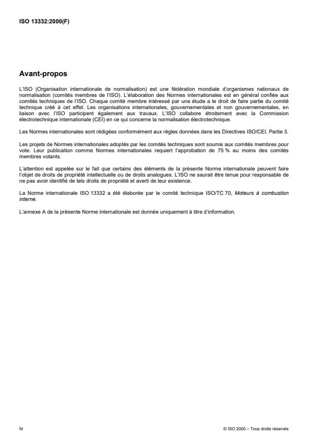 ISO 13332:2000 is a standard published by the International Organization for Standardization (ISO). Its full title is "Reciprocating internal combustion engines - Test code for the measurement of structure-borne noise emitted from high-speed and medium-speed reciprocating internal combustion engines measured at the engine feet". This standard covers: La présente Norme internationale spécifie un mode opératoire permettant de mesurer la capacité d'un moteur à vitesse élevée ou à vitesse moyenne à générer des vibrations et de déterminer les fréquences limites de validité des informations données. La méthode décrite dans la présente Norme internationale n'est pas appropriée aux moteurs à faible vitesse. La présente Norme internationale décrit une méthode d'expertise et non une méthode de laboratoire. Qu'ils soient réalisés au banc d'essai ou sur site, les essais doivent faire l'objet d'un accord entre l'utilisateur et le constructeur. La présente Norme internationale s'applique aux moteurs alternatifs à combustion interne à vitesse élevée et à vitesse moyenne pour usages terrestre, ferroviaire et marin, à l'exclusion des moteurs utilisés pour la propulsion des tracteurs agricoles, des véhicules routiers et des aéronefs. La présente Norme internationale peut être appliquée aux moteurs destinés à propulser des engins de travaux publics et de terrassement, ou des chariots de manutention, ainsi que pour d'autres applications où aucune Norme internationale appropriée n'existe.