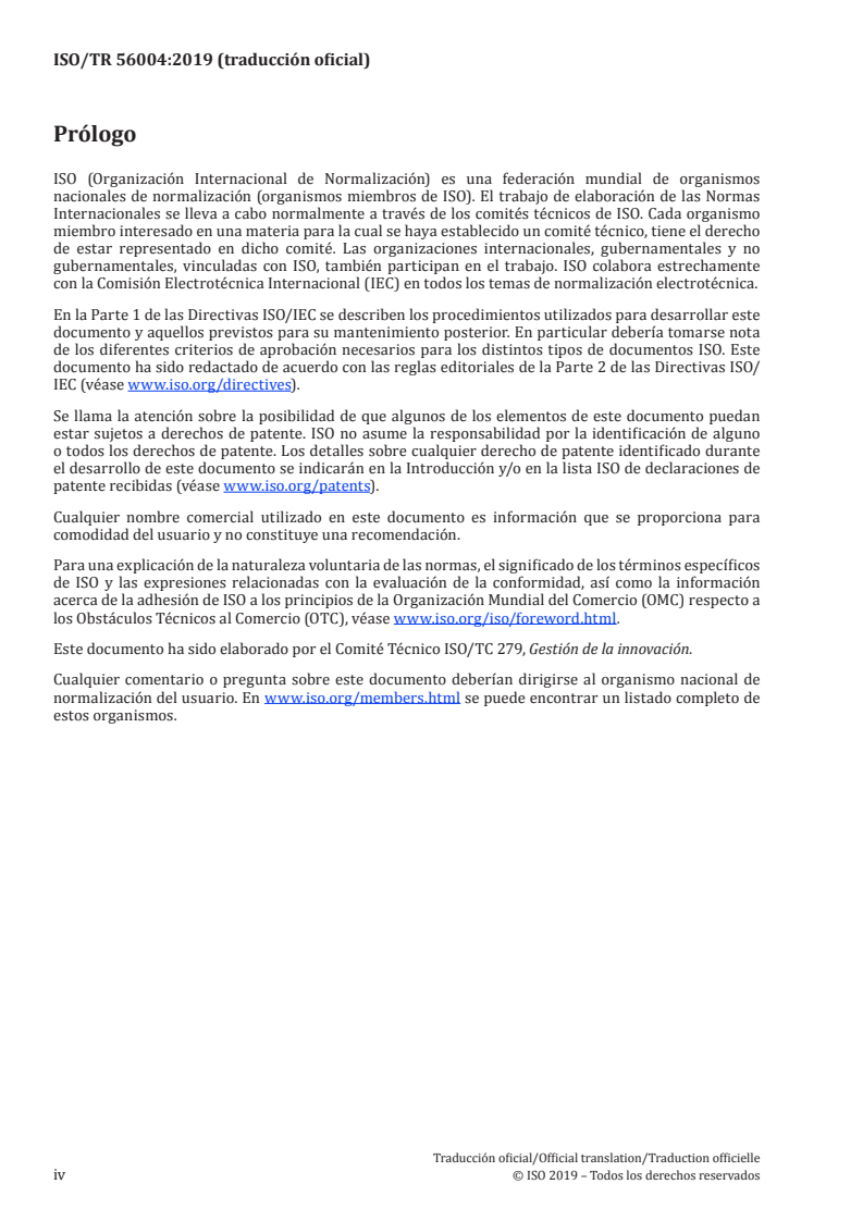 ISO/TR 56004:2019 is a technical report published by the International Organization for Standardization (ISO). Its full title is "Innovation Management Assessment - Guidance". This standard covers: This document will help the user understand why it is beneficial to carry out an Innovation Management Assessment (IMA), what to assess, how to carry out the IMA, and thus maximize the resulting benefits, which are universally applicable to: - organizations seeking sustained success in their innovation activities; - organizations performing IMAs; - users and other interested parties (e.g. customers, suppliers, partners, funding organizations, universities and public authorities) seeking confidence in an organization's ability to manage innovation effectively; - interested parties seeking to improve communication through a common understanding of Innovation Management (IM), via an assessment; - providers of training, assessment, or advice in IM; - developers of related standards; - academics interested in research related to IMA. Further, this document is intended to be applicable to: - all types of organizations, regardless of sector, age, size, or country; - all approaches to IM regardless of their level of sophistication, and complexity; - all modalities of managing innovation whether centralized or decentralized; - all ways to innovate, e.g. internal, collaborative, open, user-, market- or technology-driven innovation; - all types of innovation such as product, service, process, business model, organizational innovation from incremental to radical.