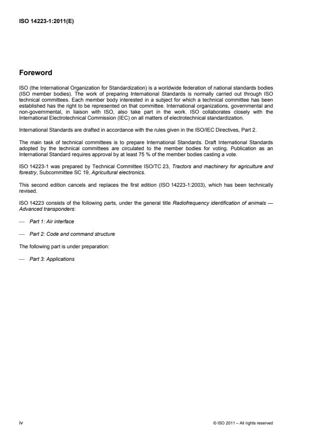 ISO 14223-1:2011 is a standard published by the International Organization for Standardization (ISO). Its full title is "Radiofrequency identification of animals - Advanced transponders - Part 1: Air interface". This standard covers: ISO 14223-1:2011 specifies the air interface between the transceiver and the advanced transponder used in the radiofrequency identification of animals, this specification being fully backwards-compatible with those of ISO 11784 and ISO 11785.