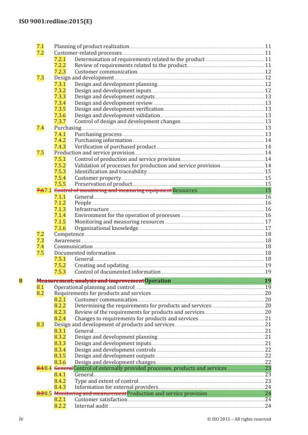 - Support: resources, competence, awareness, infrastructure and documented information (creation, updating and control). The redline content highlights updated documentation requirements and control of records.