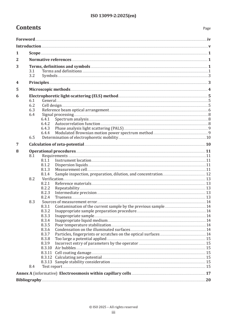ISO 13099-2:2025 is a standard published by the International Organization for Standardization (ISO). Its full title is "Colloidal systems - Methods for zeta-potential determination - Part 2: Optical methods". This standard covers: This document specifies two methods of measurement of the electrophoretic mobility of particles suspended in a liquid: video microscopy and electrophoretic light-scattering. NOTE Estimation of surface charge and determination of zeta-potential can be achieved from measured electrophoretic mobility using proper theoretical models, which are described in detail in ISO 13099-1.
