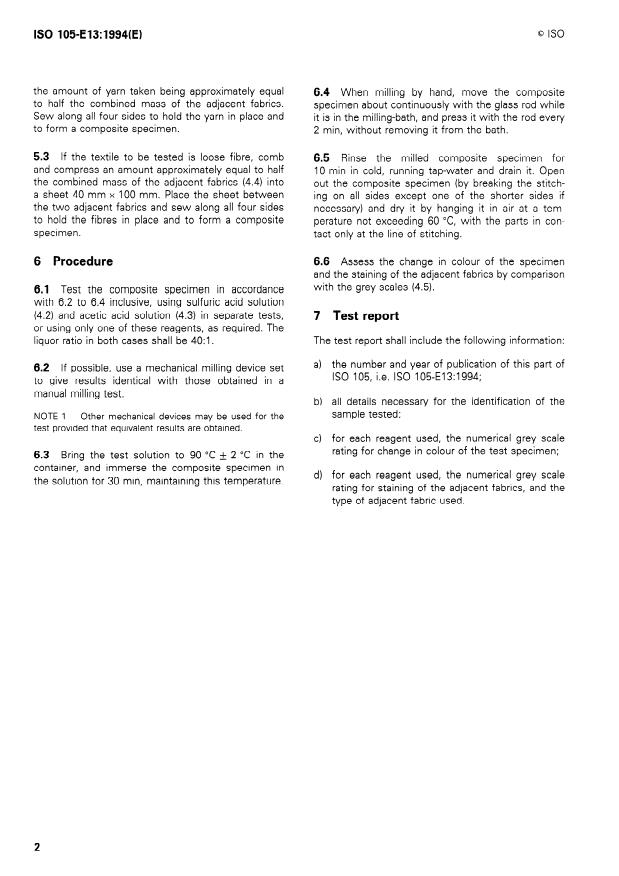 ISO 105-E13:1994 is a standard published by the International Organization for Standardization (ISO). Its full title is "Textiles - Tests for colour fastness - Part E13: Colour fastness to acid-felting: Severe". This standard covers: A specimen of the textile (textiles in all kinds and in all forms) in contact with adjacent fabrics is milled in solutions of acetic and/or sulfuric acid, rinsed and dried. The change in colour of the specimen and the staining of the adjacent fabrics are assessed with the grey scales.