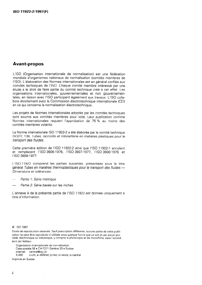 ISO 11922-2:1997 - Tubes en matières thermoplastiques pour le transport des fluides — Dimensions et tolérances — Partie 2: Série basée sur les inches Released:4/3/1997