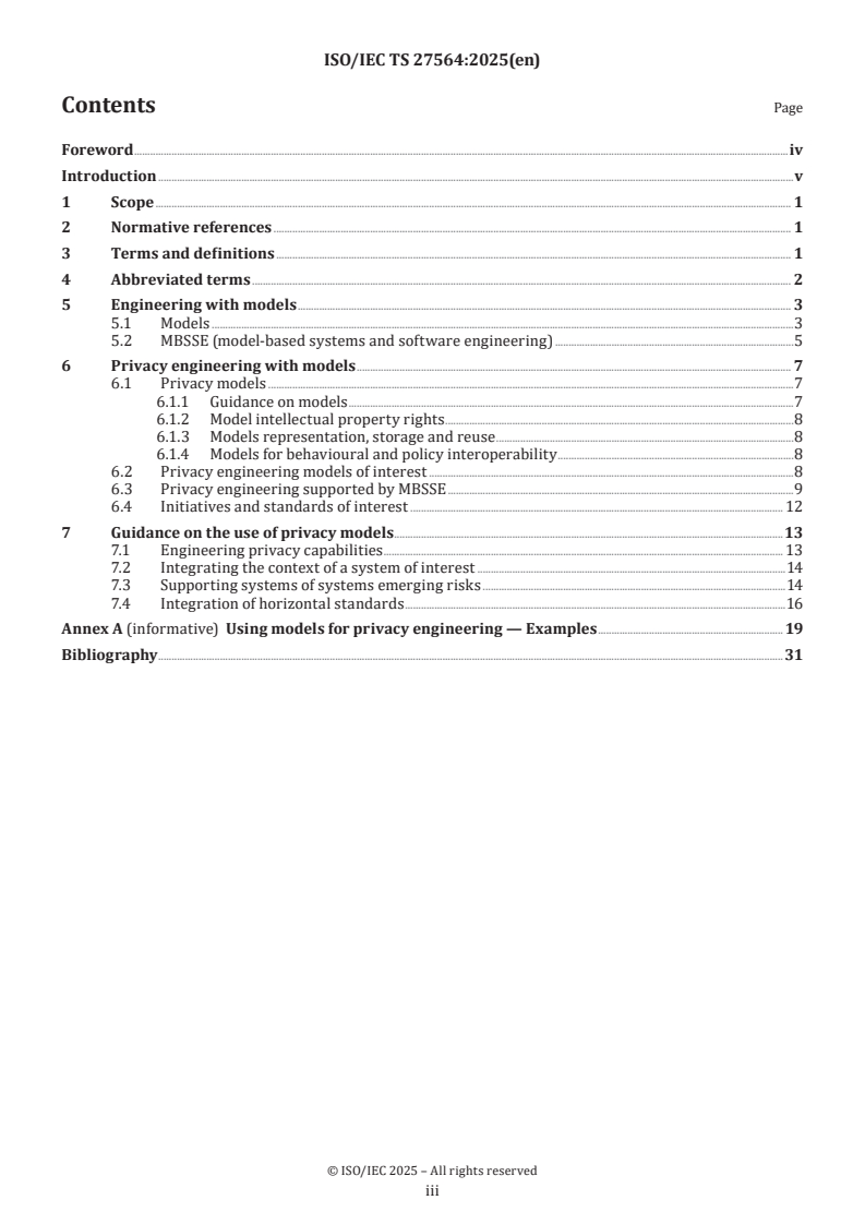 ISO/IEC TS 27564:2025 is a technical specification published by the International Organization for Standardization (ISO). Its full title is "Privacy protection - Guidance on the use of models for privacy engineering". This standard covers: This document provides guidance on how to use modelling in privacy engineering. It describes categories of models that can be used, the use of modelling to support engineering, and the relationships with other references, including International Standards on privacy engineering and on modelling. It provides high-level use cases describing how models are used.