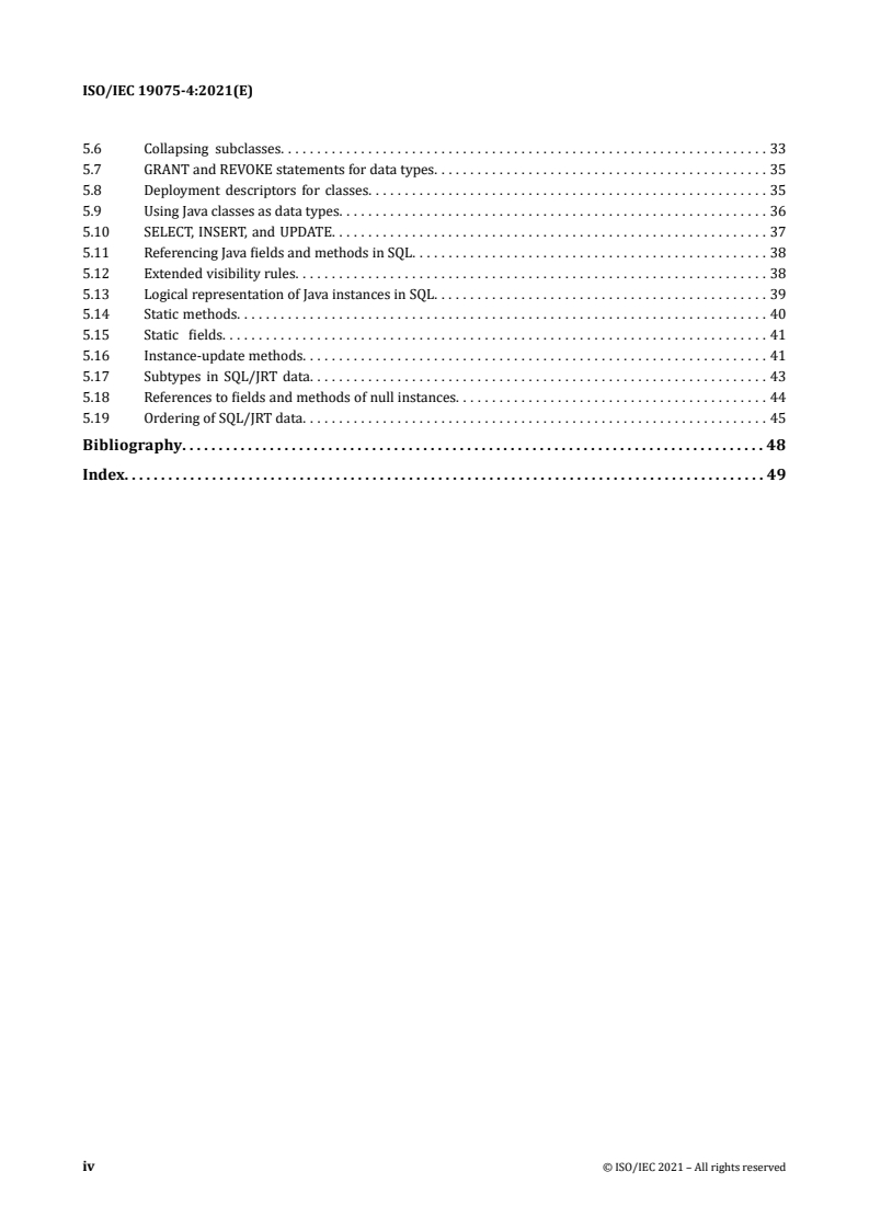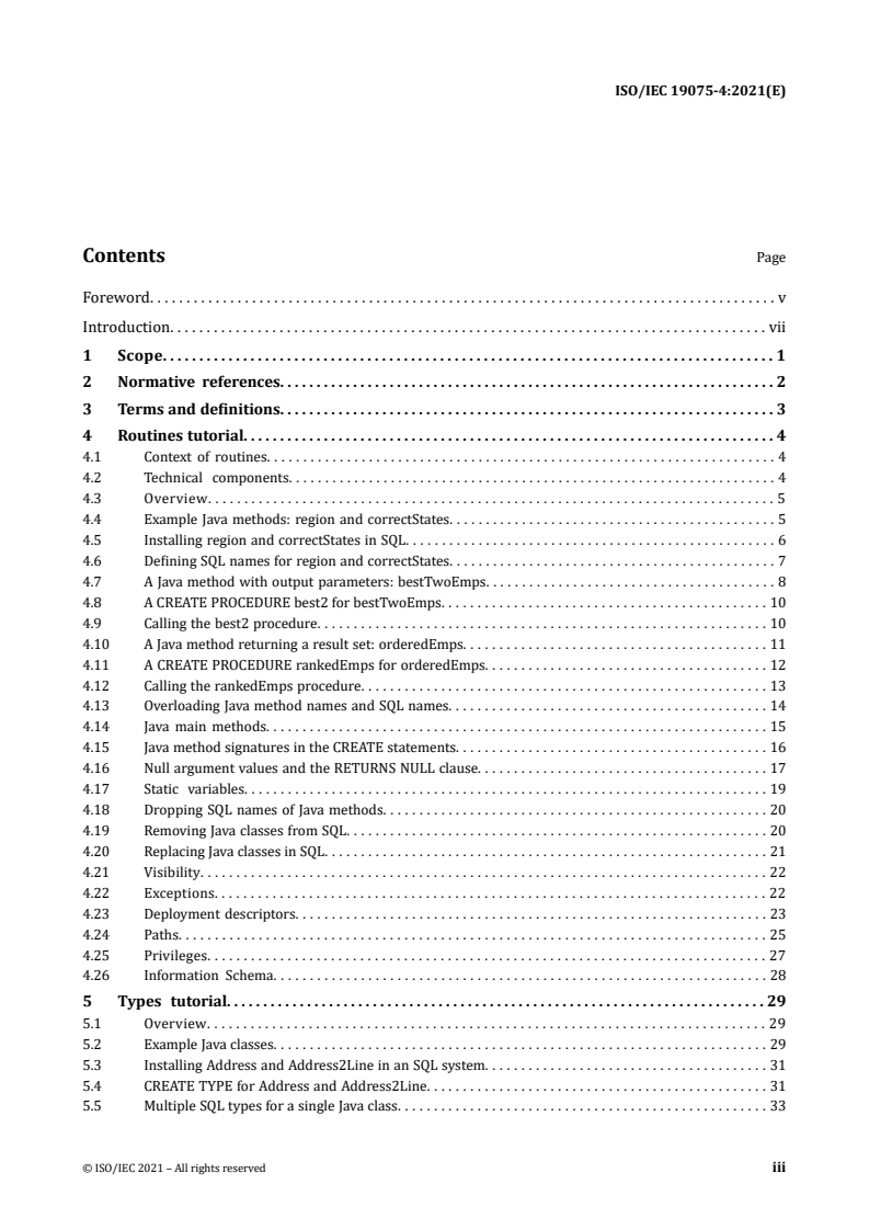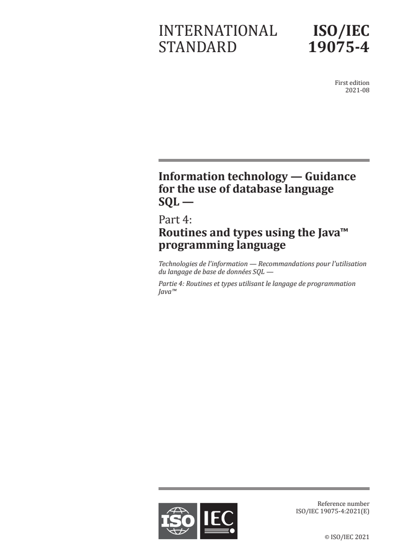 ISO/IEC 19075-4:2021 is a standard published by the International Organization for Standardization (ISO). Its full title is "Information technology - Guidance for the use of database language SQL - Part 4: Routines and types using the Java™ programming language". This standard covers: This document provides a tutorial of SQL routines and types using the Java™ programming language. This document discusses the following features of the SQL Language: - The use of routines written in the Java programming language within SQL expressions and statements. - The use of user-defined types written in the Java programming language within SQL expressions and statements.