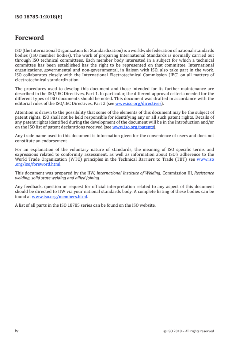 ISO 18785-1:2018 is a standard published by the International Organization for Standardization (ISO). Its full title is "Friction stir spot welding - Aluminium - Part 1: Vocabulary". This standard covers: This document defines friction stir spot welding (FSSW) process terms and definitions. In this document, the term "aluminium" refers to aluminium and its alloys.