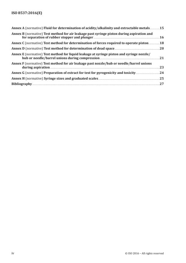 - Normative test methods - Annexes A–H provide specific test fluids and methods (e.g., pyrogenicity extracts, force testing, dead space).