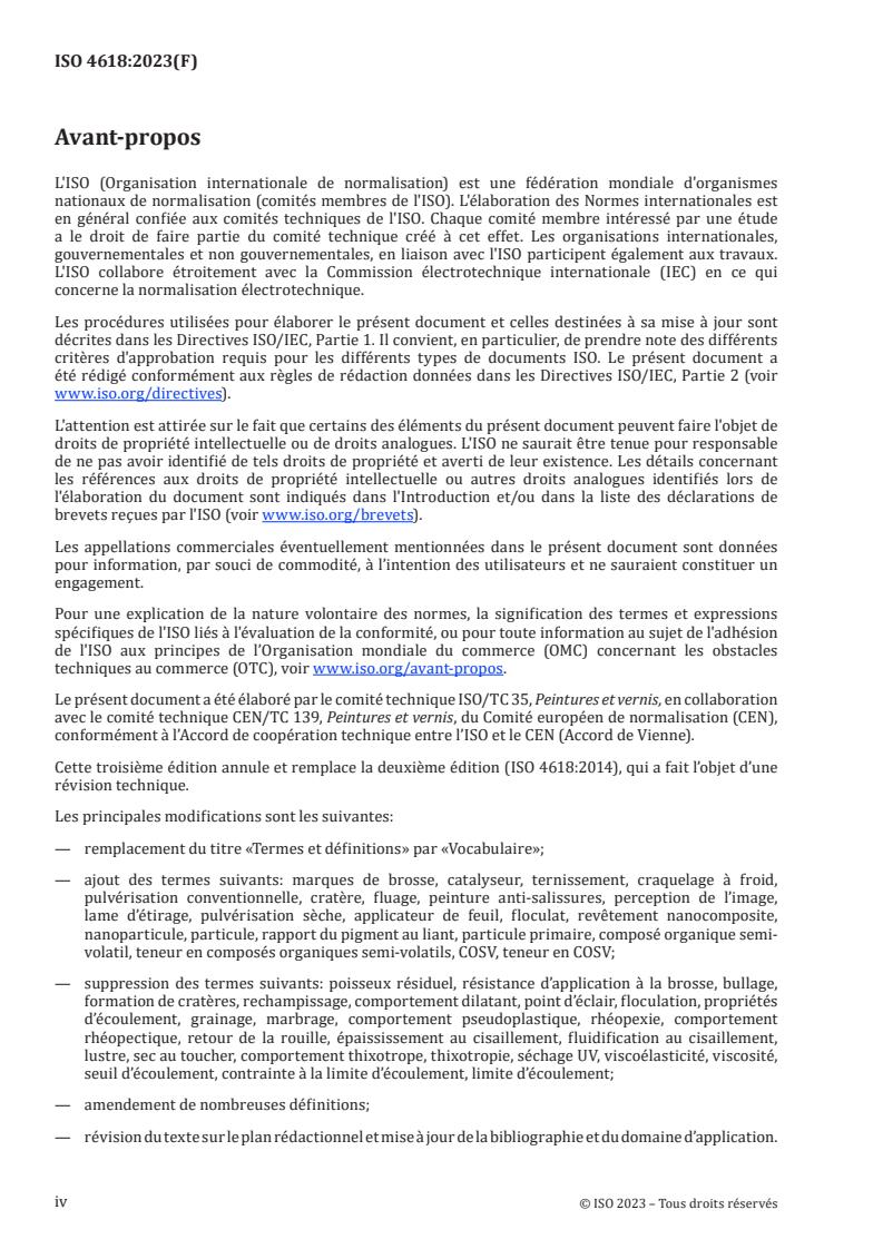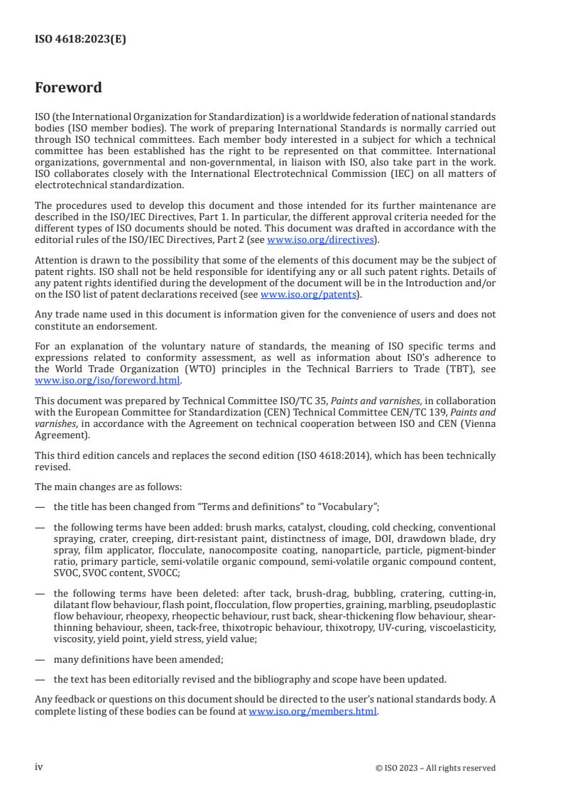 ISO 4618:2023 is a standard published by the International Organization for Standardization (ISO). Its full title is "Paints and varnishes - Vocabulary". This standard covers: This document defines terms used in the field of coating materials (paints, varnishes and raw materials for paints and varnishes). Terms relating to specific applications and properties are dealt with in standards concerning those applications and properties, including corrosion protection (see the ISO 12944 series), coating powders (see ISO 8130-14), electro-deposition coatings (see ISO 22553-1) and rheology (see ISO 3219-1). Terms on nanotechnologies are harmonized with the ISO 80004 series. Terms on pigments and extenders are harmonized with ISO 18451-1.