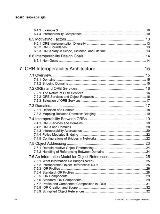 ISO/IEC 19500-2:2012 specifies a comprehensive, flexible approach to supporting networks of objects that are distributed across and managed by multiple, heterogeneous CORBA-compliant Object Request Brokers (ORBs). The approach to inter-ORB operation is universal, because elements can be combined in many ways to satisfy a very broad range of needs. ISO/IEC 19500-2:2012 specifies ORB interoperability architecture Inter-ORB bridge support General Inter-ORB Protocol (GIOP) for object request broker (ORB) interoperability. GIOP can be mapped onto any connection-oriented transport protocol that meets a minimal set of assumptions defined by this International Standard Internet Inter-ORB Protocol (IIOP), a specific mapping of the GIOP which runs directly over connections that use the Internet Protocol and the Transmission Control Protocol (TCP/IP connections) CORBA Security Attribute Service (SAS) protocol and its use within the CSIv2 architecture to address the requirements of CORBA security for interoperable authentication, delegation, and privileges ISO/IEC 19500-2:2012 provides a widely implemented and used particularization of ITU-T Rec. X.931 | ISO/IEC 14752. It supports interoperability and location transparency in ODP systems.
