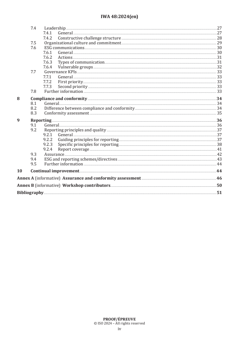 IWA 48:2024 - Framework for implementing environmental, social and governance (ESG) principles (ISO) provides a high‑level, practical framework to implement and embed ESG principles across an organization’s culture, management and reporting practices. The document focuses on enabling consistent, comparable and reliable ESG performance measurement and maturity assessment worldwide. It is explicitly not a reporting standard but is complementary and interoperable with voluntary and regulatory reporting frameworks to support global harmonization.