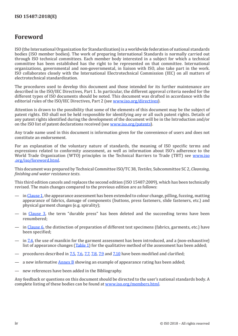 ISO 15487:2018 is a standard published by the International Organization for Standardization (ISO). Its full title is "Textiles - Method for assessing appearance of apparel and other textile end products after domestic washing and drying". This standard covers: This document specifies a method of test for evaluating the appearance of apparel and other textile end products after one or several domestic washing and drying treatments. The appearance evaluated includes colour change, pilling, fuzzing, matting appearance of fabrics, smoothness appearance of flat fabric and seams, and the retention of pressed-in creases in garments and other textile products, damage of components ? buttons, press fasteners, slide fasteners, etc. This document is applicable to any washable textile end product of any fabric construction. Techniques for seaming and creasing are not included since the purpose is to evaluate textile end products as they are supplied from the manufacturer or as ready-to-use. Techniques for seaming and creasing are controlled by fabric properties. This method has been developed primarily for use with domestic washing machines of Type B as defined in ISO 6330, but it can be used with any type of machine defined in ISO 6330. It is recognized that prints and patterns can mask the wrinkled appearance present in textile end products. The rating process is, however, based on the visual appearance of specimens including such effects.