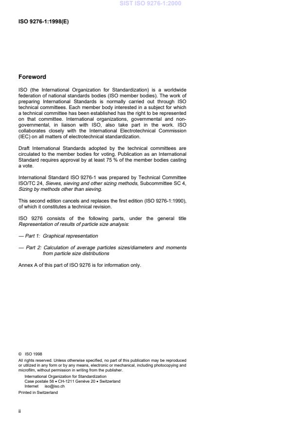 ISO 9276-1:1998 is a standard published by the International Organization for Standardization (ISO). Its full title is "Representation of results of particle size analysis - Part 1: Graphical representation". This standard covers: Representation of results of particle size analysis - Part 1: Graphical representation