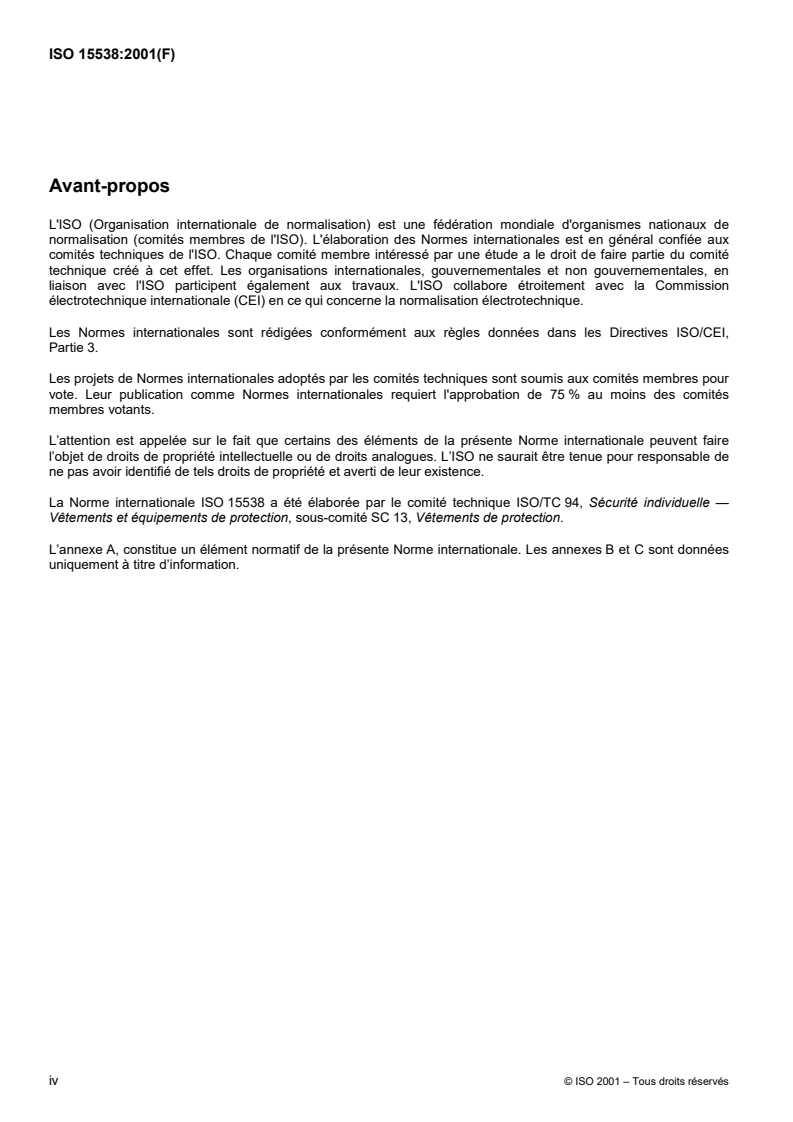ISO 15538:2001 is classified under the following ICS (International Classification for Standards) categories: 13.340.10 - Protective clothing. The ICS classification helps identify the subject area and facilitates finding related standards.