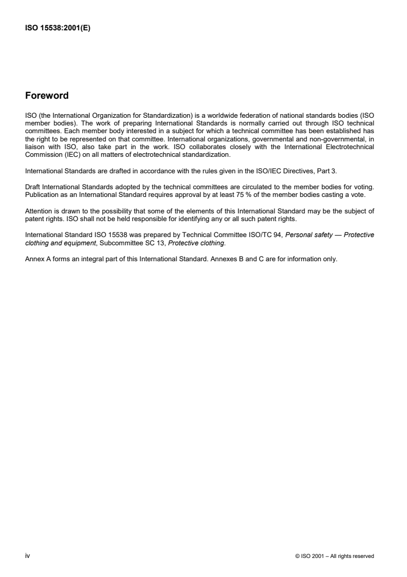 ISO 15538:2001 - Protective clothing for firefighters — Laboratory test methods and performance requirements for protective clothing with a reflective outer surface Released:10/4/2001