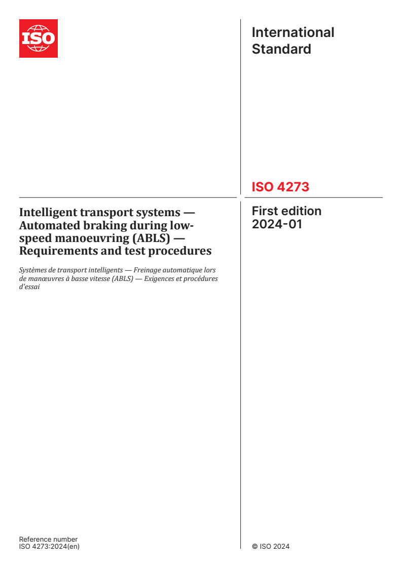 Keywords: ISO 4273:2024, ABLS, automated braking during low‑speed manoeuvring, intelligent transport systems, low‑speed collision mitigation, ADAS testing, parking safety.