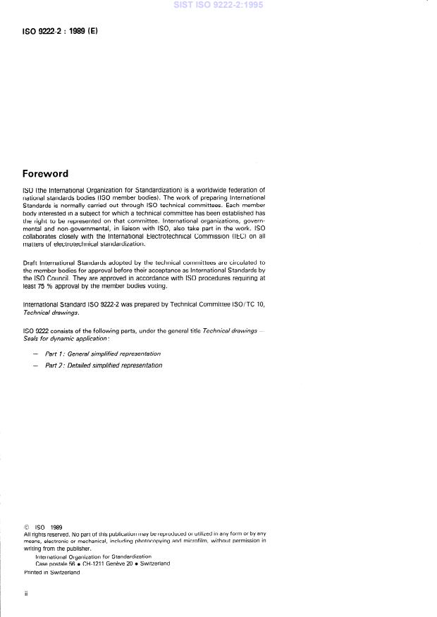 ISO 9222-2:1989 is a standard published by the International Organization for Standardization (ISO). Its full title is "Technical drawings - Seals for dynamic application - Part 2: Detailed simplified representation". This standard covers: In contrast to the general simplified representation of part 1, this method shows more details of a seal, for example the configuration of lips. It should also be used when it is not necessary to show the exact shape and details of the seals, for example in assembly drawings. Elements and examples of this representation mode are given in tables and figures.