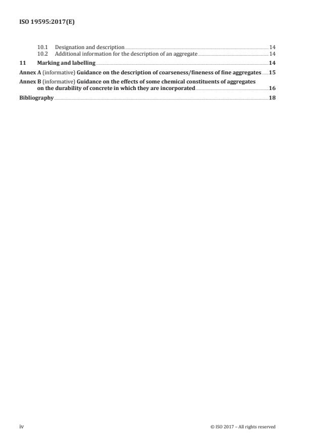 ISO 19595:2017 is a standard published by the International Organization for Standardization (ISO). Its full title is "Natural aggregates for concrete". This standard covers: ISO 19595:2017 specifies the properties and requirements of aggregates obtained by processing natural materials and mixtures of these aggregates for use in concrete. It is applicable to aggregates with an oven-dried particle density greater than 2,00 Mg/m3 (2 000 kg/m3) in accordance with ISO 22965 (all parts). ISO 19595:2017 incorporates a general requirement that natural aggregates are not intended to release any harmful substances in excess of the maximum permitted levels specified for the material or permitted in the national regulations of the place in use. National provisions, preferably given in a national annex or a project specification, can specify additional or deviating requirements. NOTE Requirements for the end use of aggregates in concrete are specified in ISO 22965 (all parts).