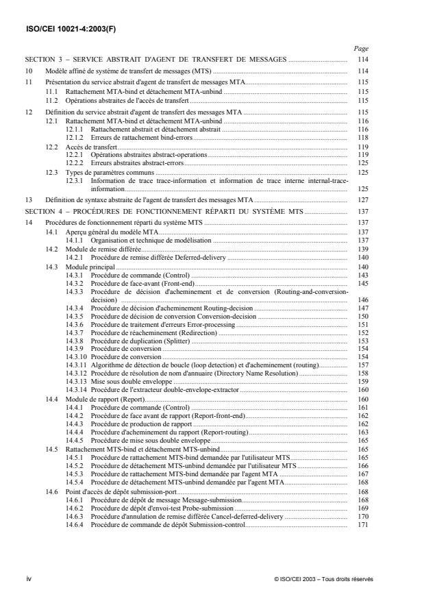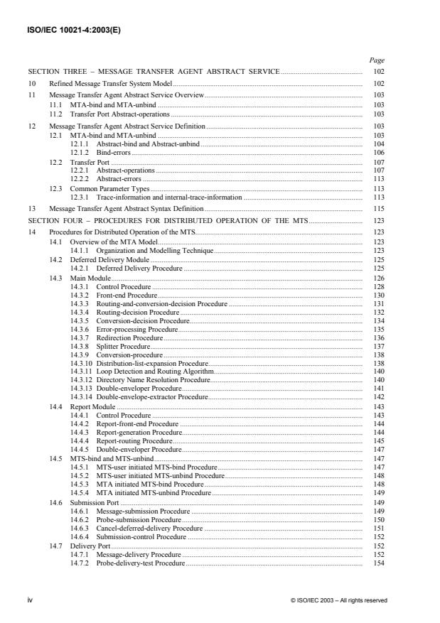ISO/IEC 10021-4:2003 | ITU-T Rec. X.411 defines the Message Transfer System (MTS) Abstract Service and the MTS Model, and provides an overview of the MTS Abstract Service. It defines both the semantics of the parameters of the MTS Abstract Service and the abstract-syntax of the MTS Abstract Service. ISO/IEC 10021-4:2003 | ITU-T Rec. X.411 defines the Message Transfer Agent (MTA) Abstract Service and refines the model of the MTS to show that the MTS comprises a number of MTAs that interwork with one another to provide the MTS Abstract Service. An overview of the MTA Abstract Service is provided. ISO/IEC 10021-4:2003 | ITU-T Rec. X.411 defines both the semantics of the parameters of the MTA Abstract Service and the abstract-syntax of the MTA Abstract Service. It specifies the procedures performed by MTAs to ensure the correct distributed operation of the MTS.