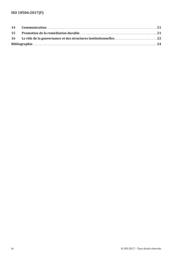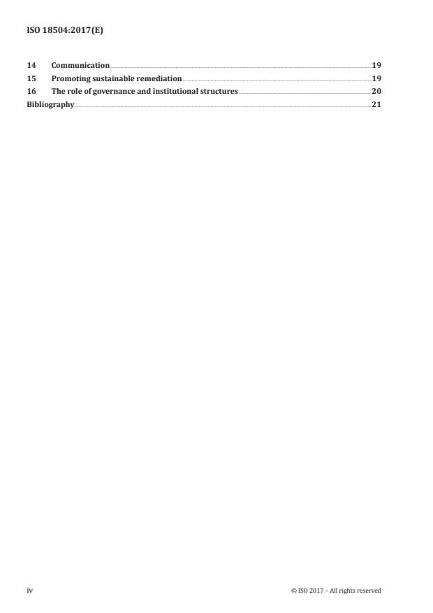 ISO 18504:2017 provides procedures on sustainable remediation. In particular, it provides: - standard methodology, terminology and information about the key components and aspects of sustainable remediation assessment; - informative advice on the assessment of the relative sustainability of alternative remediation strategies. ISO 18504:2017 is intended to inform practitioners about contemporary understanding of sustainable remediation. It is not intended to prescribe which methods of assessment, indicators or weights to use. Rather, it is intended to inform consideration of the concept of sustainable remediation in a local legal, policy, socio-economic and environmental context. The scope of ISO 18504:2017 is restricted to sustainable remediation ? that is demonstrably breaking the source-pathway-receptor linkages ? in a manner that has been shown on a site-specific basis under a specific legal context to be sustainable. The concepts of "green remediation" and "green and sustainable remediation" (so called GSR) that in some parts of the world are conflated with sustainable remediation are neither endorsed nor discussed in ISO 18504:2017.