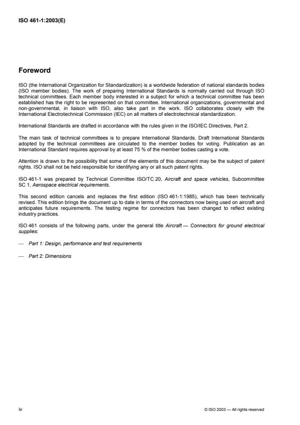 ISO 461-1:2003 specifies the design, performance and test requirements for electrical connectors used to supply electrical power from a ground source to an aircraft. ISO 461-2 specifies the dimensions of the connectors.