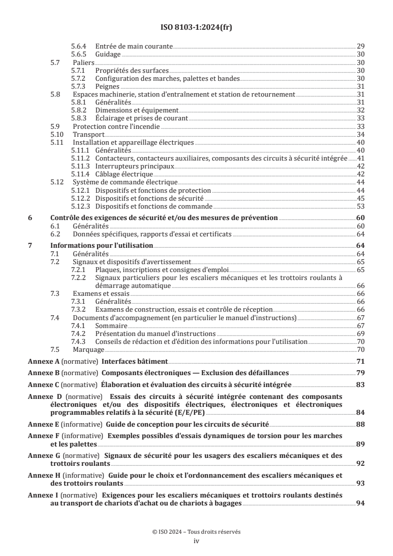 La norme ISO 8103-1:2024, intitulée "Escalators and moving walks - Part 1: Safety requirements", établit un cadre essentiel pour garantir la sécurité des nouvelles installations d'escalators et de passages mobiles, qu'ils soient de type palette ou ceinture. Le champ d'application de cette norme est vital, car il couvre tous les dangers significatifs ainsi que les situations et événements dangereux qui peuvent survenir lors de l'utilisation de ces équipements, qu'ils soient employés conforme ou dans des conditions d'utilisation abusives raisonnablement prévisibles par le fabricant. L'un des principaux points forts de la norme ISO 8103-1:2024 réside dans son approche exhaustive des risques associés aux escalators et passages mobiles. La norme fournit des exigences claires et concises qui aident à identifier, évaluer, et minimiser les risques potentiels, ce qui est crucial pour la protection des usagers. En intégrant des mesures de sécurité appropriées, la norme contribue significativement à la préservation de la vie et à la réduction des accidents liés à l'utilisation de ce type d'équipement. De plus, bien que la norme ne s'applique pas aux escalators et passages mobiles fabriqués avant sa publication, elle recommande fortement que les installations existantes soient adaptées conformément à ses directives. Cela souligne la pertinence durable de la norme, qui, par ses recommandations, vise à améliorer la sécurité de toutes les installations en service, permettant ainsi de combler le fossé entre les anciennes et nouvelles technologies. En somme, la norme ISO 8103-1:2024 est une référence incontournable pour toute entreprise opérant dans le secteur des escalators et des passages mobiles, en garantissant que les équipements répondent aux exigences de sécurité les plus élevées. Elle est pertinente non seulement pour les nouvelles installations, mais également pour l'amélioration continue des systèmes existants, ce qui en fait un document indispensable pour les fabricants, les installateurs et les utilisateurs.