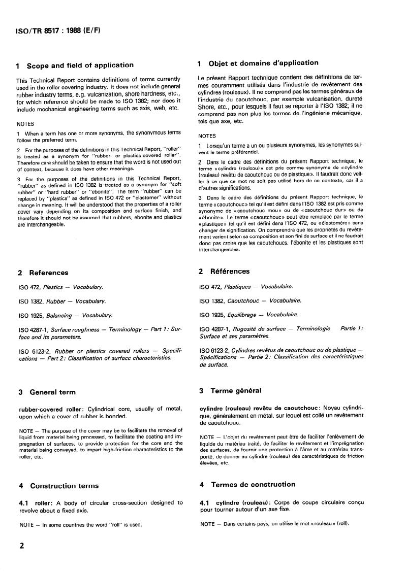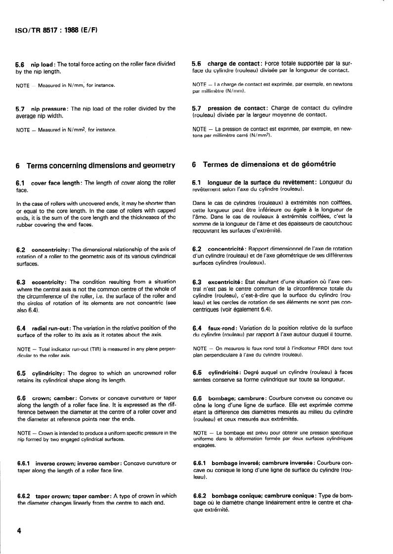 ISO/TR 8517:1988 is a technical report published by the International Organization for Standardization (ISO). Its full title is "Rubber- or plastics-covered rollers - Glossary". This standard covers: Defines in English and French 135 terms of structure, operating conditions, dimensions and geometry of the rollers, surface characteristics of plane and grooved rollers and balance. Alphabetical indices in English and French.