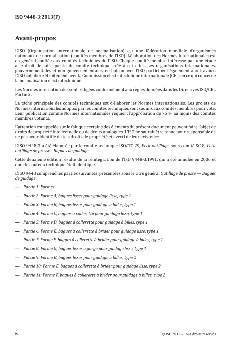 L'ISO 9448-3:2013 prescrit les principales dimensions et tolérances, en millimètres, des bagues de guidage de forme B, bagues lisses pour guidage à billes, type 1, destinées à être utilisées dans les outillages de presse et devant être montées dans une semelle par ajustement serré. Elle donne des indications relatives aux matériaux, prescrit une dureté et spécifie la désignation des bagues conformes à l'ISO 9448-3:2013.