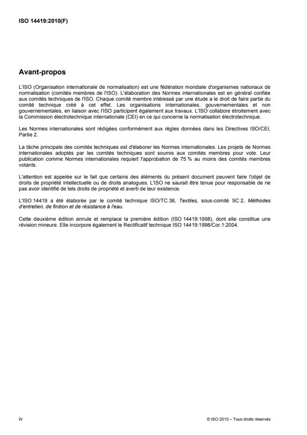 제목: ISO 14419:2010 - 섬유 제품에 대한 기름 방수성 및 탄화수소 저항성 시험 내용: ISO 14419:2010은 다양한 표면 장력을 가진 일련의 액체 탄화수소에 대한 기원료의 흡수 저항성을 평가하는 데 적용됩니다. ISO 14419:2010은 기름 얼룩 방지에 대한 가이드를 제공하기 위해 개발되었습니다. 일반적으로, 기름 방수 등급이 높을수록 특히 액체 오일 물질에 의한 얼룩 형성에 대한 저항성이 우수합니다. 특정 기원료에 대한 다양한 마무리재 비교 시에도 이러한 경향이 나타납니다. 또한, ISO 14419:2010은 섬유 기원료의 기름 방수 특성에 세탁 및/또는 드라이클리닝 처리가 어떠한 부정적인 영향을 미치는지 확인하는 데에도 활용될 수 있습니다. 그러나 ISO 14419:2010은 모든 오일성 물질에 의한 기원료의 채색에 대한 저항성을 절대적으로 측정하는 목적은 아닙니다. 기름성 물질의 성분, 점도, 기원료 구조, 섬유 종류, 염색 및 기타 마무리제 등과 같은 다른 요소들도 채색 저항성에 영향을 미칩니다. 또한, ISO 14419:2010은 기원료에 대한 기름성 화학 물질의 침투 저항성을 추정하는 목적으로 사용되지 않습니다.