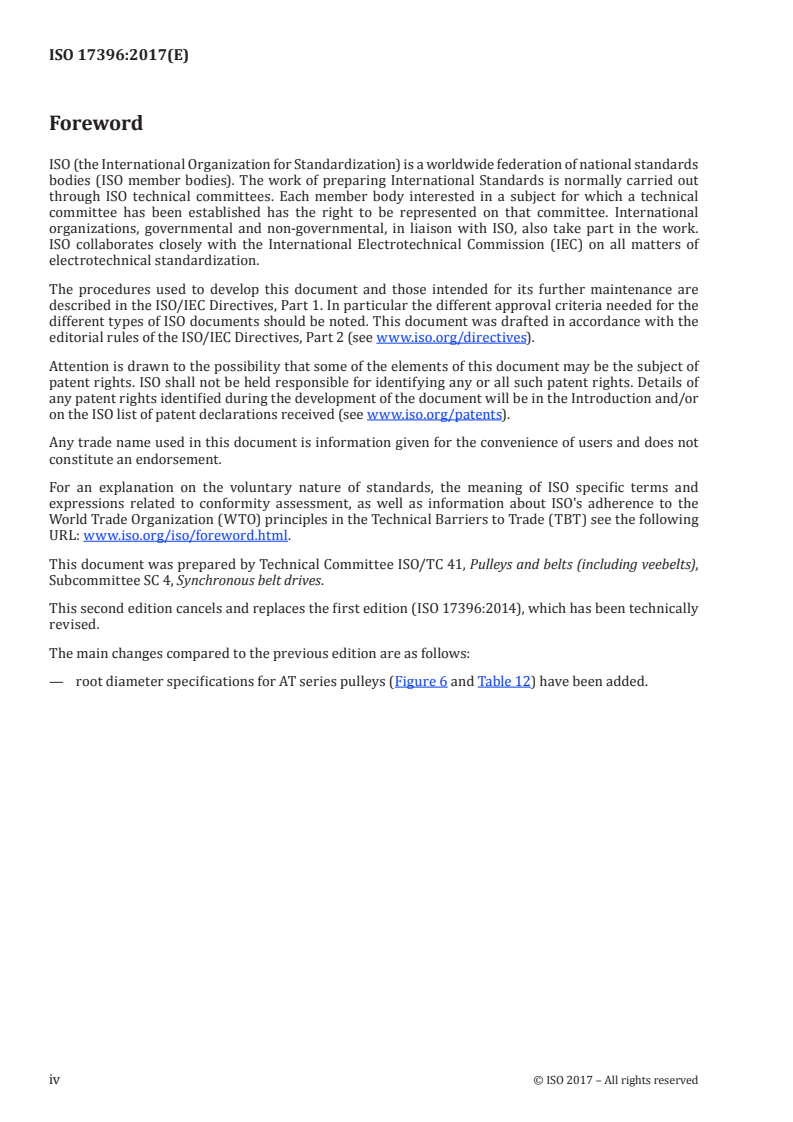 ISO 17396:2017 – Synchronous belt drives - Metric pitch - Tooth profiles T and AT defines the principal characteristics of metric synchronous (timing) belts and pulleys for profile systems T and AT. It covers both endless and open-ended belts used for mechanical power transmission and positive indexing/synchronization. The standard clarifies belt and pulley nomenclature, dimensions, tolerances, measurement procedures and material considerations for reliable design, manufacture and verification.