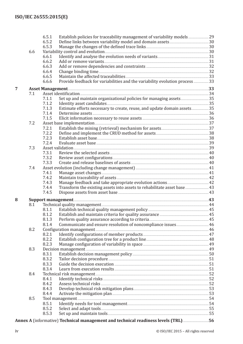 Keywords: ISO/IEC 26555:2015, product line technical management, software product lines, variability management, asset management, configuration management, domain engineering, application engineering, tool selection, technical risk management.
