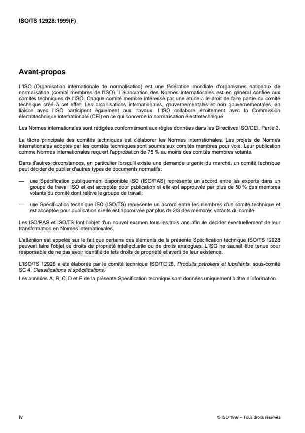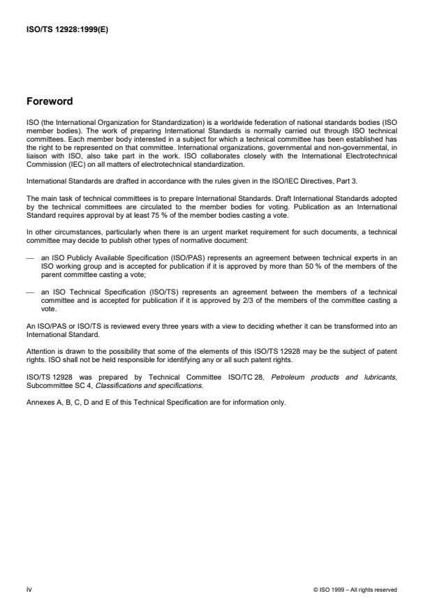 ISO/TS 12928:1999 is a technical specification published by the International Organization for Standardization (ISO). Its full title is "Lubricants, industrial oils and related products (class L) - Family R (Products for temporary protection against corrosion) - Guidelines for establishing specifications". This standard covers: This Technical Specification has been prepared with the following purposes: _ to facilitate the application of ISO 6743-8 and to specify the characteristics to be taken into account when establishing specifications for a given application; _ to enable these characteristics to serve as a basis for discussion between the end user and the supplier. This Technical Specification does not cover specific requirements which should be examined separately with a view to a common agreement between the end user and the product supplier. This Technical Specification does not cover the health, safety, disposal and environment areas which should be delft with separately, according to the regulations or laws in force in each country.