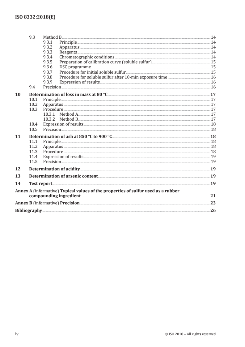 ISO 8332:2018 is a standard published by the International Organization for Standardization (ISO). Its full title is "Rubber compounding ingredients - Sulfur - Methods of test". This standard covers: This document specifies methods of test for determining the main physical and chemical properties of sulfur used for compounding dry rubber. Several of these properties can be determined by more than one test method and the user can choose the most appropriate method following the description of the test method principles provided under the corresponding clauses. NOTE Typical levels for the relevant properties of sulfur for use as a rubber compounding ingredient are contained in Annex A, for information only.