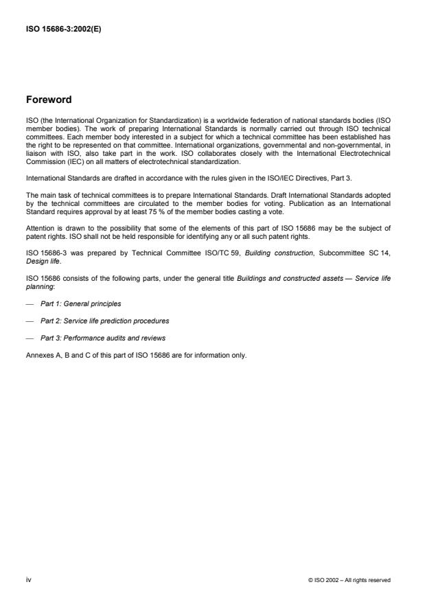 ISO 15686-3:2002 is a standard published by the International Organization for Standardization (ISO). Its full title is "Buildings and constructed assets - Service life planning - Part 3: Performance audits and reviews". This standard covers: ISO 15686-3:2002 is concerned with ensuring the effective implementation of service life planning. It describes the approach and procedures to be applied to pre-briefing, briefing, design, construction and, where required, the life care management and disposal of buildings and constructed assets to provide a reasonable assurance that measures necessary to achieve a satisfactory performance over time will be implemented. The cost implications of service life planning and the broader issues of sustainability (e.g. embodied energy, land use) are not developed in ISO 15686-3:2002.