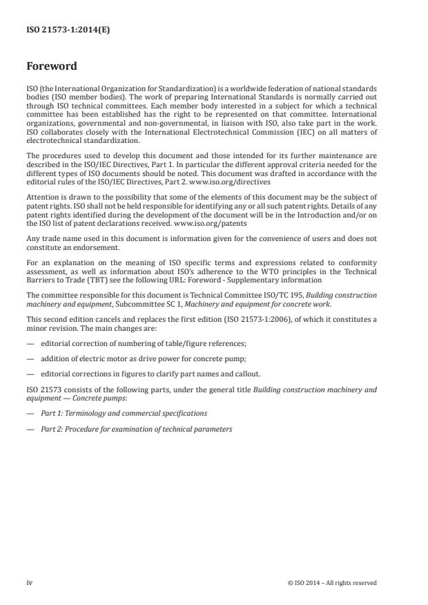 Keywords: ISO 21573-1:2014, concrete pumps, terminology, commercial specifications, piston-type, rotary-type, distributing boom, hydraulic system, maximum theoretical pumping capacity.