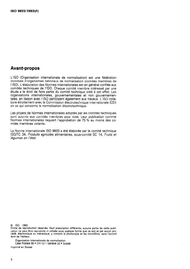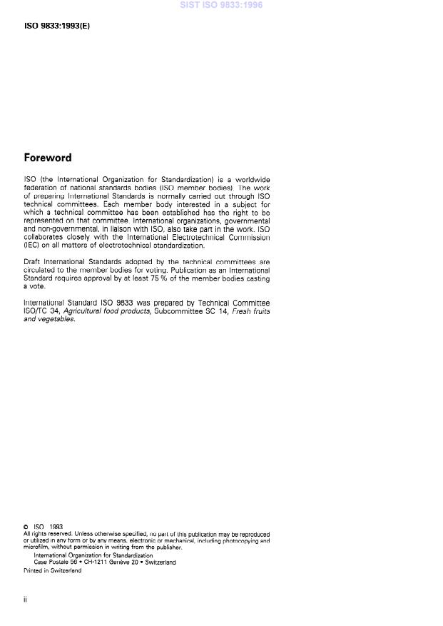 ISO 9833:1993 is a standard published by the International Organization for Standardization (ISO). Its full title is "Melons - Cold storage and refrigerated transport". This standard covers: Gives guidance on the operations to be carried out before and the conditions to be met during the cold storage and refrigerated transport of melons (Cucumis melo L.): harvesting, quality, packing, pre-cooling, optimum conditions during refrigerated transport and cold storage, operations to be carried out during storage, duration of storage. Applies to early, mid- and late-ripening cultivars of melons.