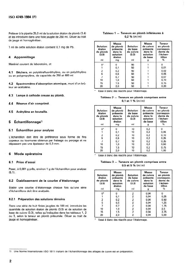 ISO 4749:1984 - Alliages de cuivre -- Dosage du plomb -- Méthode par spectrométrie d'absorption atomique dans la flamme