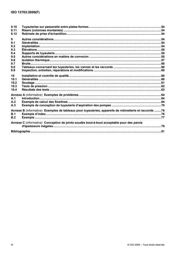 ISO 13703:2000 is a standard published by the International Organization for Standardization (ISO). Its full title is "Petroleum and natural gas industries - Design and installation of piping systems on offshore production platforms". This standard covers: La présente Norme internationale spécifie les exigences minimales et donne des lignes directrices pour la conception et l'installation de nouveaux systèmes de tuyauterie sur les plates-formes de production situées en mer, pour les industries du pétrole et du gaz naturel. Elle couvre les systèmes de tuyauterie supportant une pression maximale de 69 000 kPa, dans les limites d'une échelle de températures pour des matériaux répondant aux exigences de l'ASME B31.3. L'annexe A donne quelques exemples pratiques pour résoudre des problèmes de conception de tuyauterie.