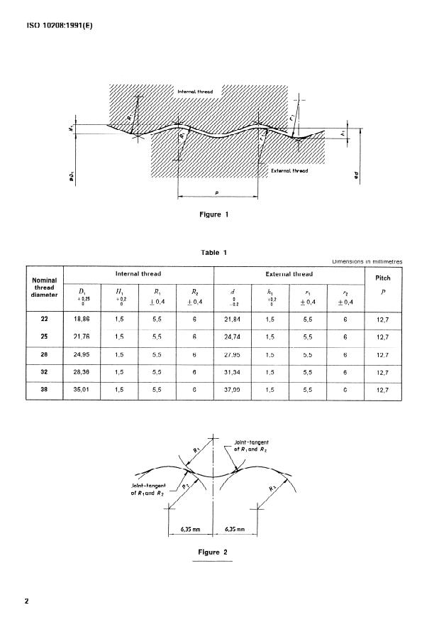 - Dimensional specifications: Provides detailed measurements including nominal thread diameters, pitches (fixed at 12.7 mm), and tolerances for internal and external threads to ensure proper fit and performance.