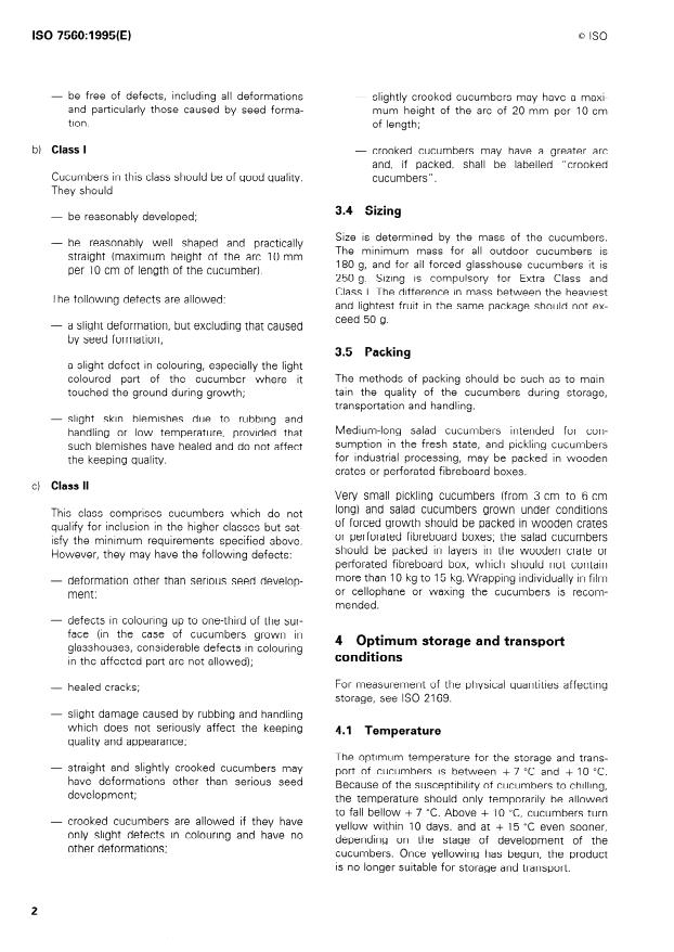 ISO 7560:1995 is a standard published by the International Organization for Standardization (ISO). Its full title is "Cucumbers - Storage and refrigerated transport". This standard covers: Gives guidance on conditions for the storage and refrigerated transport of cucumbers (Cucumis sativus L.), intended either for direct consumption or for industrial processing.