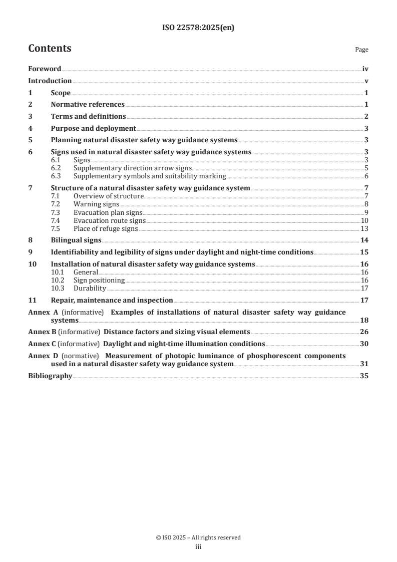 Keywords: ISO 22578:2025, natural disaster safety way guidance system, evacuation route signs, places of refuge, safety colours, phosphorescent signage, ISO 7010, ISO 16069.