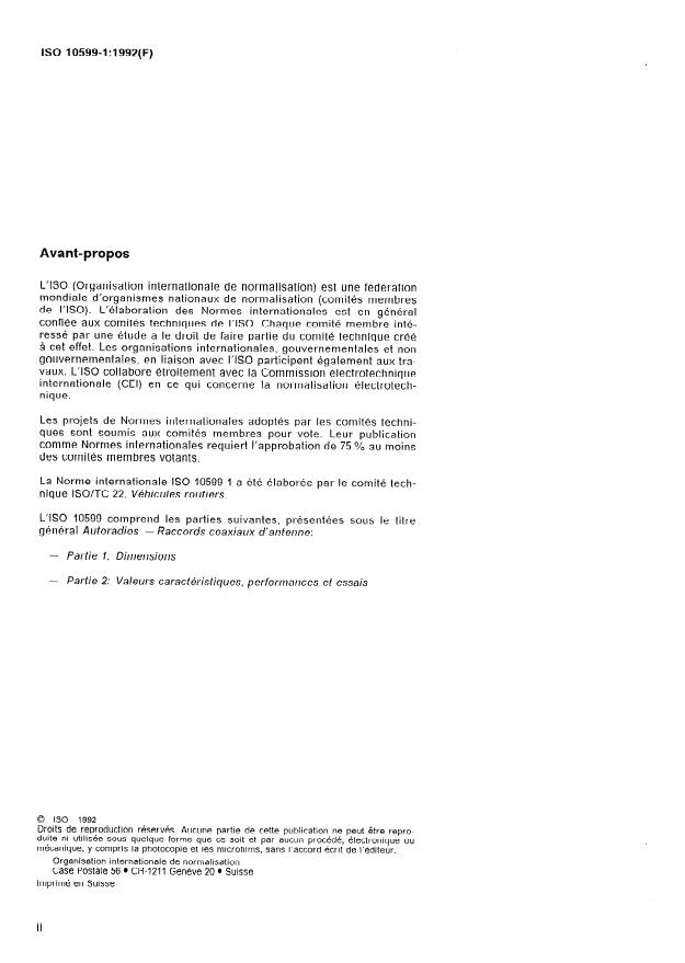 ISO 10599-1:1992 is a standard published by the International Organization for Standardization (ISO). Its full title is "Car radios - Coaxial aerial connectors - Part 1: Dimensions". This standard covers: Lays down specifications for the dimensions of the plug and socket as well as their designation.