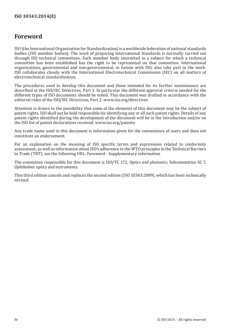 ISO 10343:2014 specifies requirements and test methods for continuously or digitally indicating ophthalmometers used to measure the radii of curvature and principal meridians of the corneal front surface and contact lenses. The standard assumes local corneal and contact-lens surfaces are spherical or toroidal and takes precedence over ISO 15004-1 where differences exist. It covers instrument performance, optical checks, test devices, documentation, and marking for compliance.