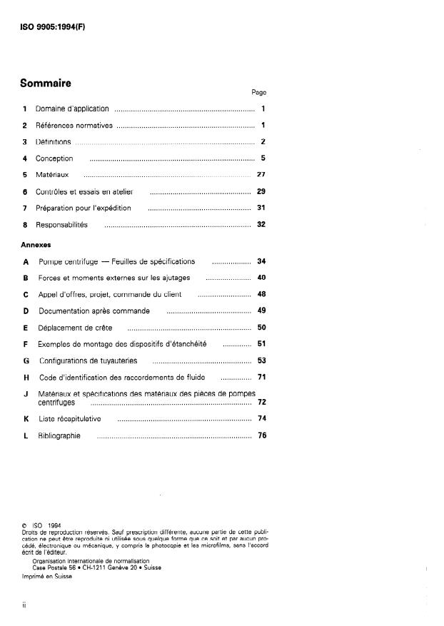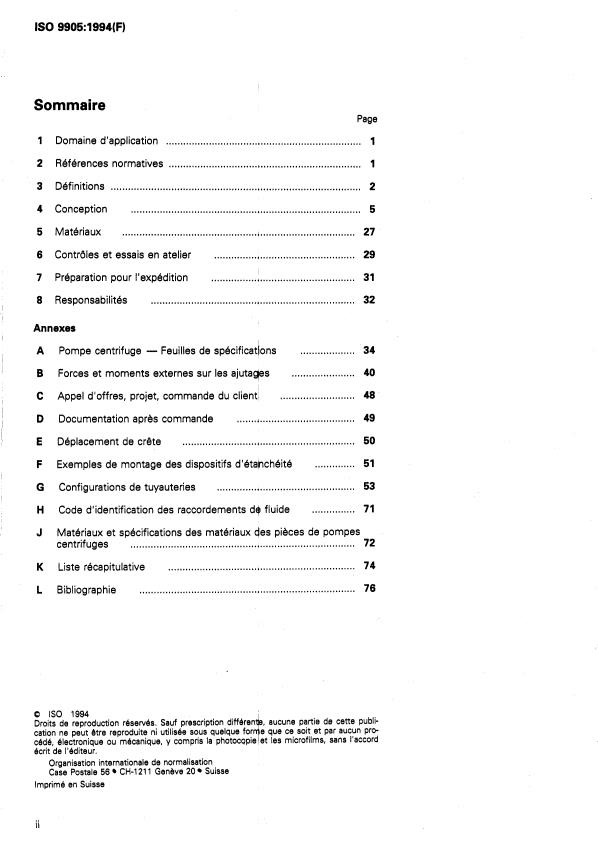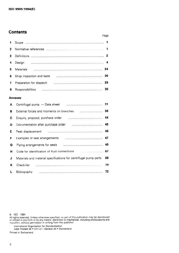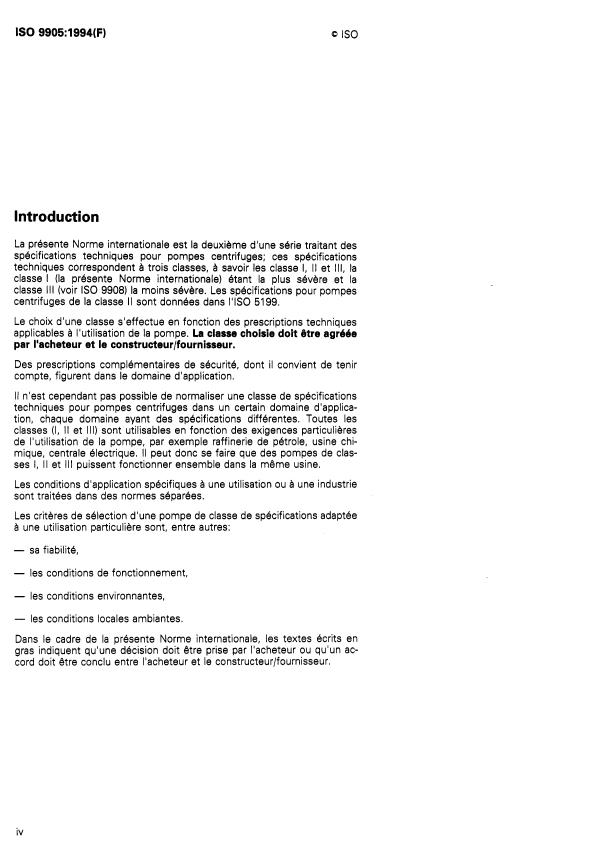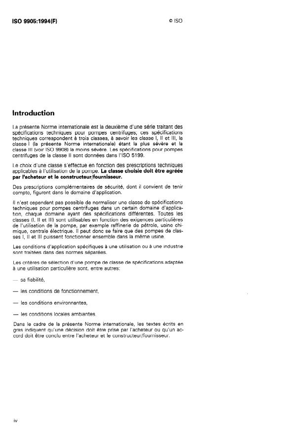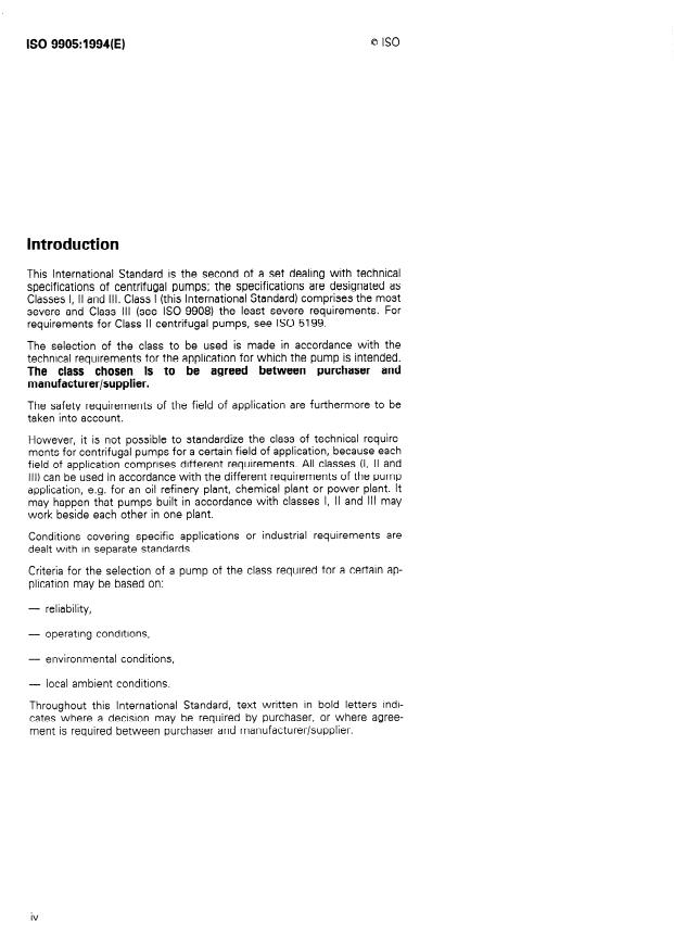 ISO 9905:1994 is a standard published by the International Organization for Standardization (ISO). Its full title is "Technical specifications for centrifugal pumps - Class I". This standard covers: Consists of a basic text covering general requirements. The technical requirements refer only to the pump unit. Includes design features concerned with installation, maintenance and safety of such pumps, including baseplate, coupling and auxiliary piping. The selection of the class to be used is made in accordance with the technical requirements for the application for which the pump is intended. The class chosen is to be agreed between purchaser and manufacturer/supplier.