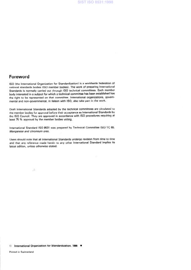 ISO 8531:1986 is a standard published by the International Organization for Standardization (ISO). Its full title is "Manganese and chromium ores - Experimental methods for checking the precision of moisture determination". This standard covers: The checking applies to manganese and chromium ores, whether natural or processed, being carried out in accordance with the methods specified in the relevant International Standards. Includes conditions for sampling, preparation of experimental samples and of final moisture samples and moisture testing, gives a data sheet and analyses the experimental data and results.