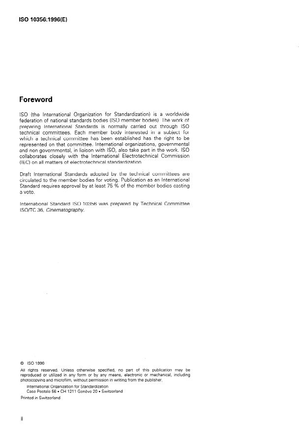 ISO 10356:1996 is a standard published by the International Organization for Standardization (ISO). Its full title is "Cinematography - Storage and handling of nitrate-base motion-picture films". This standard covers: Specifies safety aspects for handling and storage of radiation-sensitive motion-picture films which do not comply with the requirements of ISO 543. Applies to all nitrate-base films which are or have been used in motion-picture photographic systems.