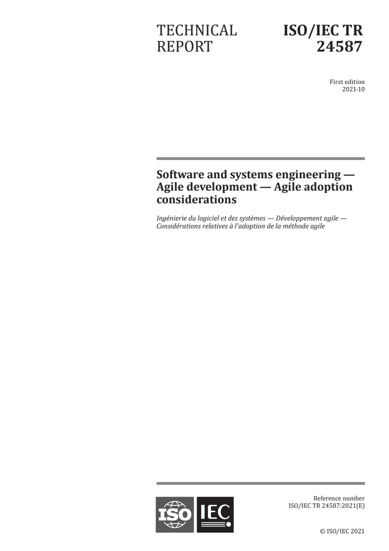 ISO/IEC TR 24587:2021 is a technical report published by the International Organization for Standardization (ISO). Its full title is "Software and systems engineering - Agile development - Agile adoption considerations". This standard covers: This document provides an overview of agile readiness factors that are likely to determine whether an organization, project, product or team is ready to start the transition to using an agile approach to their system and software development and maintenance activities. This document provides a general approach that is applicable to all agile methodologies and does not cover specific agile methodologies, such as Scrum, SAFe and eXtreme Programming (XP).